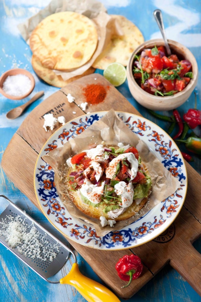 - To assemble, divide the tostadas among 6 plates. Place a spoonful of guacamole on each tortilla and top with the lettuce, then with the hot golden turkey, salsa, and a dollop of the goat’s cheese and sour cream. Sprinkle with the cheddar cheese, spring onions and garnish with the coriander leaves and extra smoked paprika. Serve immediately.